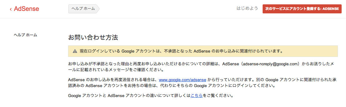 AdSenceのヘルプページから問い合わせようにも、下記のような表示が出るだけで、過去のメールも浚ってみたけど該当のメールは見つからず。