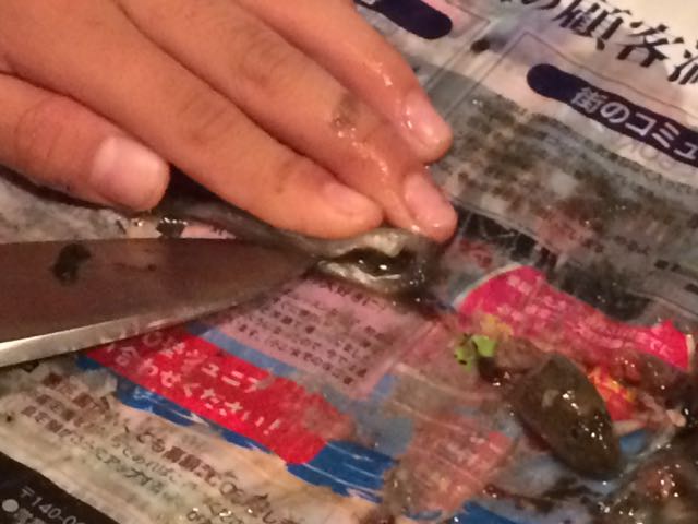 尾びれを爪で抑えて包丁を立てて鱗を引く。